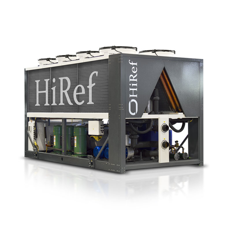 TSX is the HiRef range of air cooled liquid chillers with Scroll compressors. Three different versions (chiller, Free-Cooling chiller and reversible heat pump) and numerous models covering different power requirements make these units highly versatile and suited to a wide range of system contexts. Sizing and selection of individual components have focused on containing energy consumption, aiming to provide energy savings not just on individual chillers but the entire system. Sizing and selection of individual components have focused on containing energy consumption, aiming to optimize energy savings not just on individual chillers but the entire system. The adoption of the multiscroll solution, the use of electronically controlled expansion valves, generously-sized plate heat exchangers, software-managed integrated control of fans and circulation pumps are all key features that make the TSX range particularly efficient at partial loads. The carefully arranged component layout together with the use of compact plate heat exchangers and Scroll compressors allow to take advantage from generous condensing sections and for Free-Cooling , enough internal space for fitting a wide range of accessories and hydraulic options. Three different soundproofing systems are available: the most suitable one will depend on the importance of noise containment in the overall plant context. Adopted technical solutions include fan speed control, the use of anti-vibration devices on the refrigerating circuit, compartmentalisation of compressors and pumping kits in a box internally lined with soundabsorbing material. The Free-Cooling versions can be selected with the Glycol-Free kit (on board the unit) to confine the water-antifreeze mix inside the finned coils. This solution maximises heat exchange efficiency at the evaporator by using only pure water; it also drastically reduces pumping costs and eliminates glycol circulation inside the user system. TECHNICAL CHARACTERISTICS Scroll compressors Configurations available for the refrigerating circuit: -EFFICIENCY PACK 1 (from 50 to 226 kW): dual compressor on dual circuit for high system redundancy. -EFFICIENCY PACK 2 (from 50 to 226 kW): dual compressor (tandem) on single circuit for greater efficiency at partial loads. -EFFICIENCY PACK 4 (from 100 to 438 kW): four compressors (dual tandem) on dual circuit, for a redundant system that is also efficient at low loads. -Two or four refrigerating circuits with a number of Scroll compressors ranging from 4 to 12 for capacities above 438 kW. Electronically controlled expansion valves as standard Braze-welded stainless steel plate heat exchangers Outward hydraulic connections via Victaulic couplings Dual day/night noise emissions set-point Optional EC electronically commutated fans Programmable microprocessor control with proprietary software Integrated flow meter Second set point, on utility side, able to be activated from external input